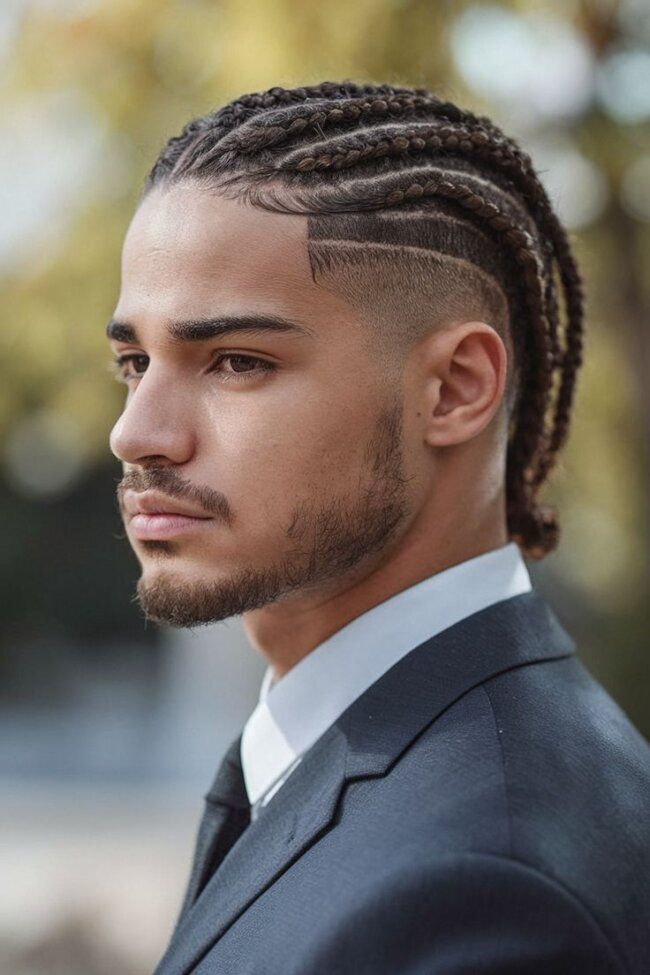 If there's one combination that defines cool braids for men in 2026, it's braids paired with a fade. The contrast between crisp, shaved sides and a detailed braided top creates a look that's both polished and expressive. This works with just about any braid style: cornrows with a mid fade, stitch braids with a skin fade, boxed braids for men with a tapered side. It's also a great entry point for men who are a little unsure about committing fully to braids, since the fade gives the overall look a familiar, barbershop-ready feel.