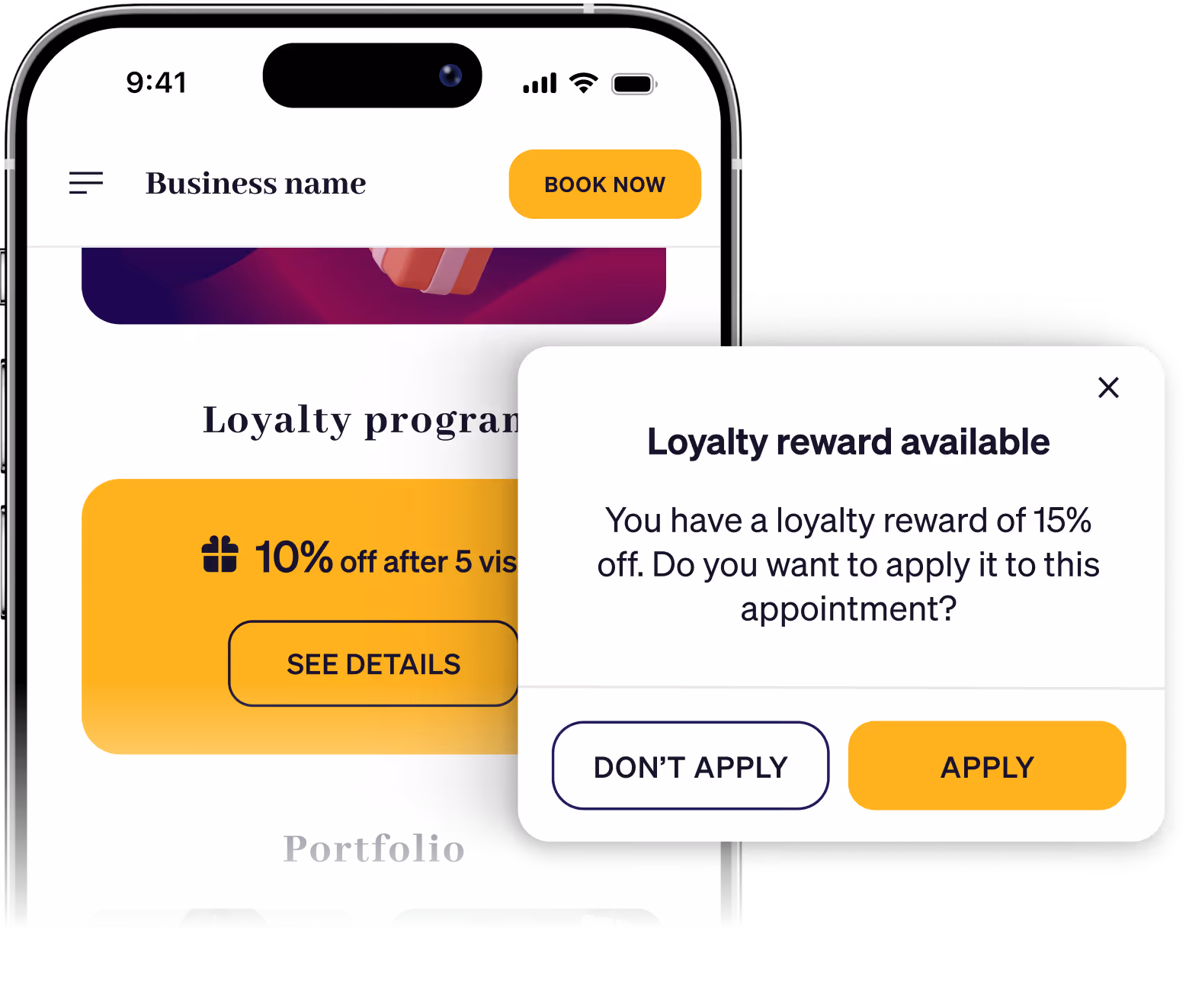 Clients see their available reward right on your booking page and can apply it in one tap, making it easy to choose you over the competition, every time.